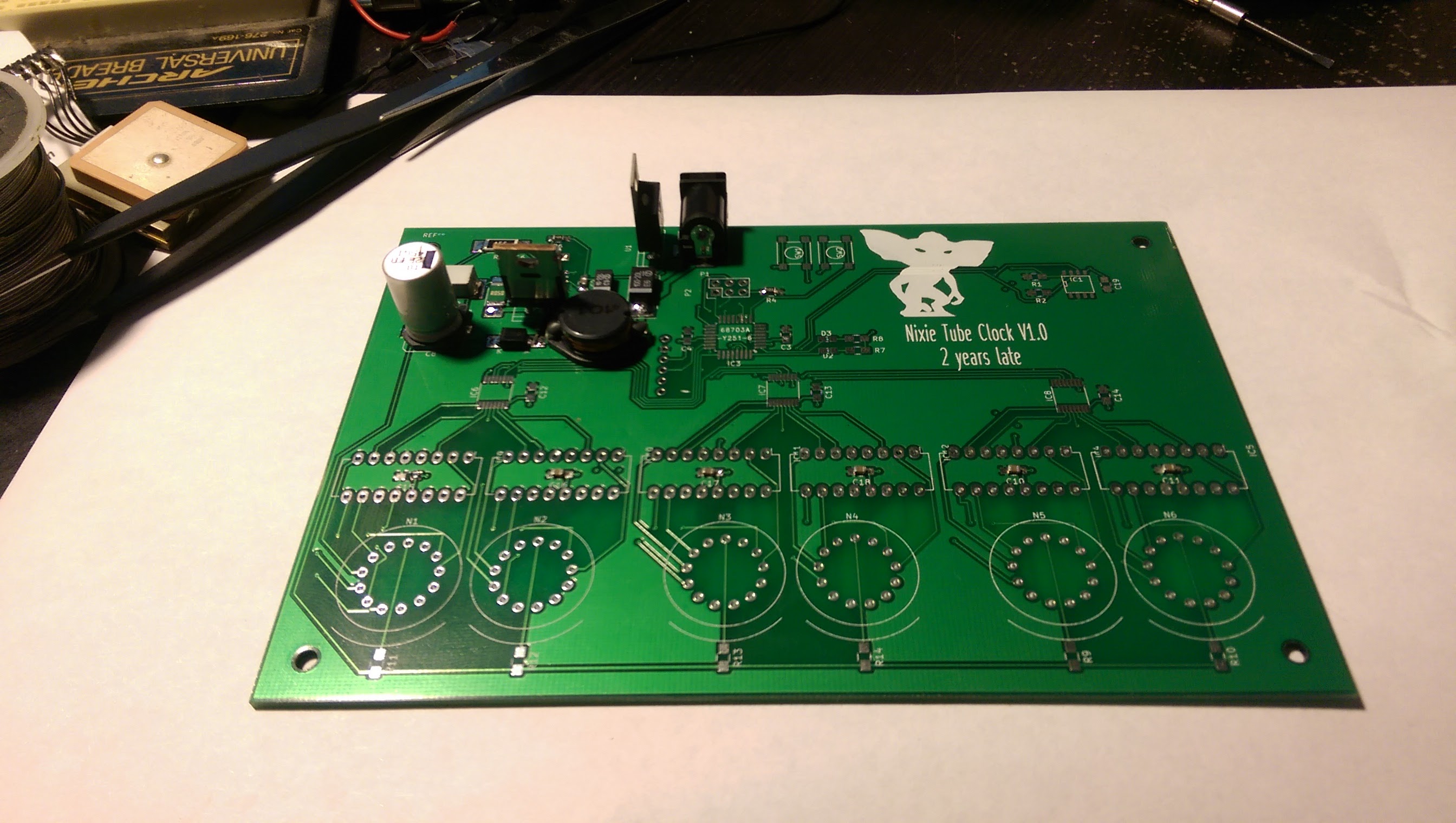 The GPS module sits on the bottom of the board and automatically sets the time. The high-voltage supply for the nixie tubes is gated by a digital output so it can be shut down in software. Shift registers drive the nixie cathode selection for all 6 digits.